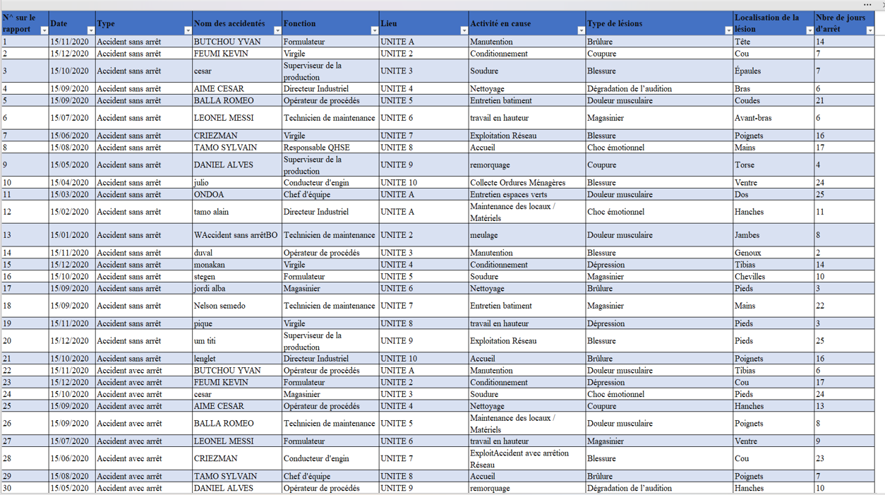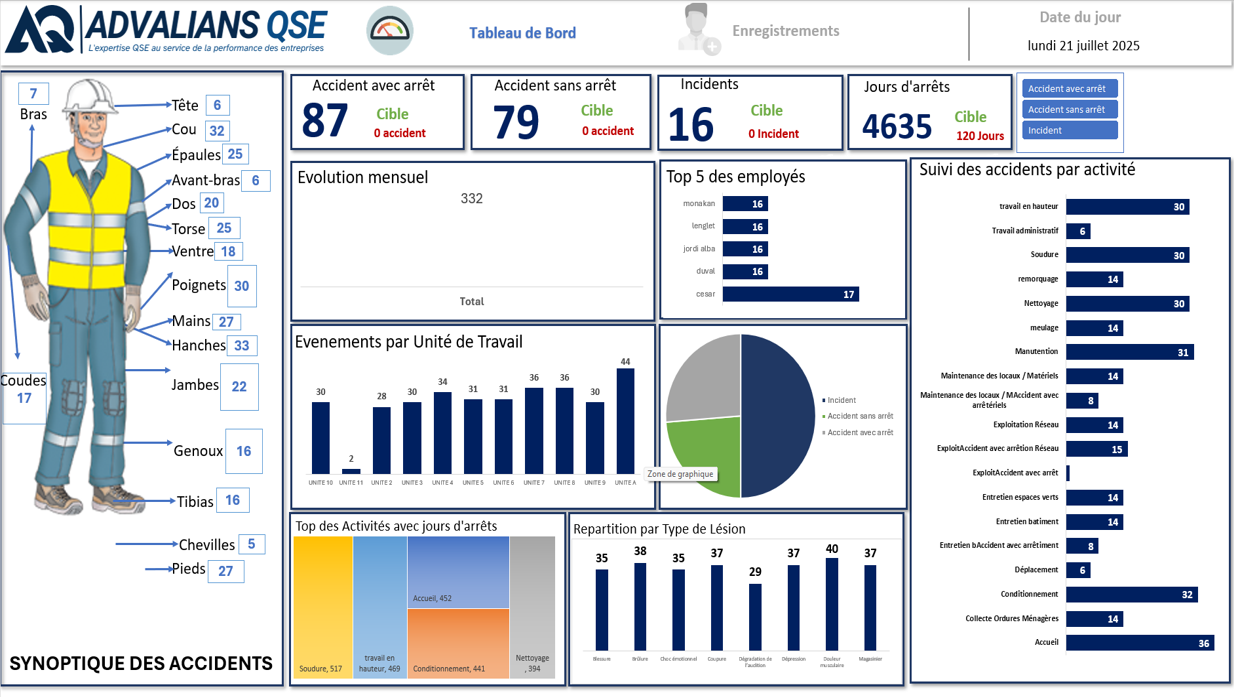 Ce tableau de bord Excel premium est conçu pour un suivi avancé des accidents de travail. Grâce à ses analyses par service et ses graphiques dynamiques, il offre une vision claire des zones à risque dans votre organisation.